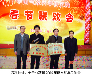 中国气象局副局长郑国光在联欢会上发表了热情洋溢的讲话,代表中国气象局党组和秦大河局长对气科院在2006年取得的成绩表示祝贺,并向气科院全体职工致以真诚的节日祝福。他说,2006年气科院通过全体员工的努力,取得了优秀达标单位的良好成绩。2007年度,气科院的任务将更加艰巨,希望全体职工在院党委的领导下,继续努力,与时俱进,加快发展,为中国气象事业的发展做出更大的贡献。