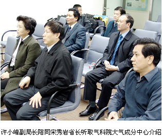 大气成分中心周凌唏研究员向宋秀岩省长详细介绍了我院开展大气成分研究与业务工作,在介绍全球大气观测站网时,宋秀岩省长对能在青海瓦里关建立全球第一个陆地大气本底台表示欣慰,并对我院开发的大气监测评估系统表示赞赏。介绍过程中,宋省长还就瓦里关大气本底台多种气体观测、标准气体及污染物传输等,尤其是与青海省发展、人民生活息息相关的许多问题与专家进行了热烈的交流讨论。