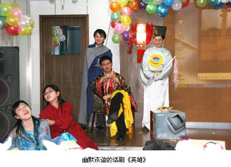 一曲打击乐拉开联欢会序幕,节奏轻快鲜明的鼓声顿时让在场的所有人耳目一新,感觉到这次联欢会必定会不同凡响。异域风情的《蓝色的蒙古高原》和滑稽逗乐的《双簧》使得现场气氛进入佳境,特别设计的游戏环节让老师们和同学们游戏互动,趁此机会,同学们给老师送上了新年的祝福。男女小合唱让在场的人无不感觉置身于音乐的海洋,享受视觉带来的愉悦。由九个同学精心彩排的话剧《英雄》作为联欢会的压轴让现场的气氛立刻进入高潮,几秒种的一个包袱让大家笑声不绝。通过幽默诙谐的台词,天马行空的表演,表达了同学们对气科院老师的感恩,对气象事业的热爱。