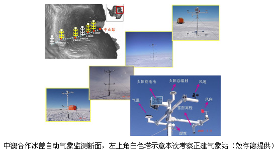 目前,中国第24次南极考察内陆考察队正在向南极冰盖最高点(DOME A)地区挺进,他们将在越过DOME A 后,在DOME A南侧再设立一个中国/美国合作自动气象站,届时在从中国南极中山站到DOME A的剖面上,中国/澳大利亚/美国合作的自动气象站将增加到6个,形成完整的监测断面。
