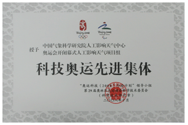 中国气象科学研究院人工影响天气中心奥运会开闭幕式人工影响天气项目组荣获“科技奥运先进集体”荣誉称号,气科院的王东海、孟青、史月琴、王亚强和周春红五位同志荣获“科技奥运先进个人”荣誉称号。