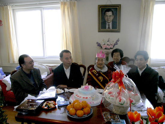 12月31日上午,中国气象局局长郑国光、原局长温克刚一同来到王回珠老人家中,向王回珠老人祝贺百岁寿诞,向老人敬送了祝寿蛋糕、盆栽绿色植物“金桔”和祝寿金,祝老人安享晚年、寿比南山。陪同祝寿的有局办公室主任于新文、局离退休办主任张玉敏和气科院院长张人禾。各位领导与王回珠老人及其家人还共享了祝寿生日蛋糕。