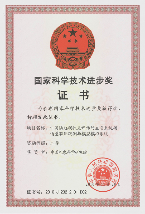 2011年1月14日中共中央、国务院在北京隆重举行2010年度国家科学技术奖励大会。大会公布了《国务院关于2010年度国家科学技术奖励的决定》。由中科院地理科学与资源研究所、中国气象科学研究院(排名第二)等单位共同完成的“中国陆地碳收支评估的生态系统碳通量联网观测与模型模拟系统”成果获国家科技进步二等奖。让我们向获得该奖项的气科院副院长周广胜研究员表示热烈地祝贺。