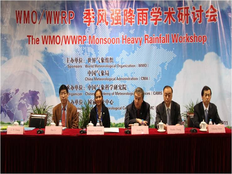 2011年10月12-14日, WMO/WWRP季风强降雨国际学术研讨会在京召开。中国气象局国际合作司喻纪新司长、科技与气候变化司李慧副司长、国家气象中心端义宏主任、世界天气研究计划大气研究处高级科学官员Nanette Lomarda、WMO世界天气研究计划(WWRP)季风工作组执行委员会主席张智北出席会议。中国气象科学研究院张人禾院长主持会议开幕式,喻纪新司长在会议开幕式上发表讲话。