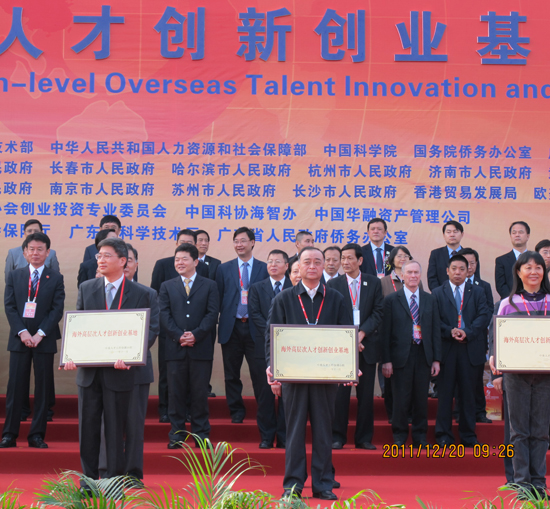 2011年12月20日,第十四届中国留学人员广州科技交流会暨第三批海外高层次人才创新创业基地授牌仪式隆重举行。中共中央政治局委员、中央书记处书记、中央组织部部长李源潮,中共中央政治局委员、广东省委书记汪洋,以及中央组织部、教育部、科技部、人力资源和社会保障部等部门与广东省有关领导共同出席开幕式,并为第三批国家“海外高层次人才创新创业基地”单位授牌。