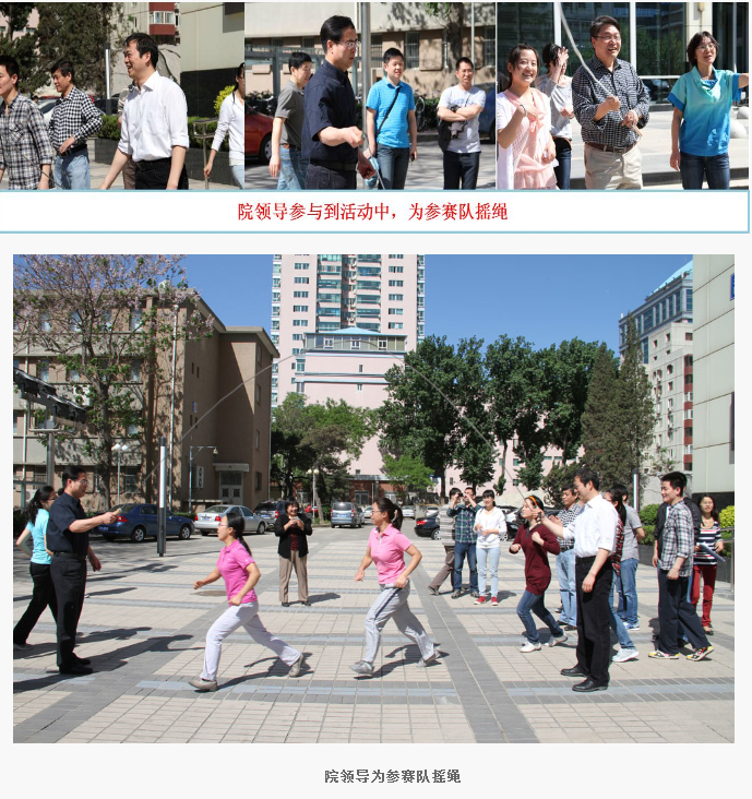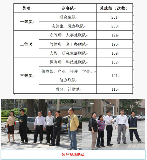 本次比赛得到了院领导和各单位领导的大力支持,端义宏院长、王怀刚副院长、赵平副院长、翟盘茂副院长到场为队员加油助威,还亲自参与到比赛活动之中为参赛队摇绳。院领导对青年工作的大力支持和对青年同志的关心厚爱,使大家倍受鼓舞和十分感动,增添了更加积极投身气象科研事业的动力。