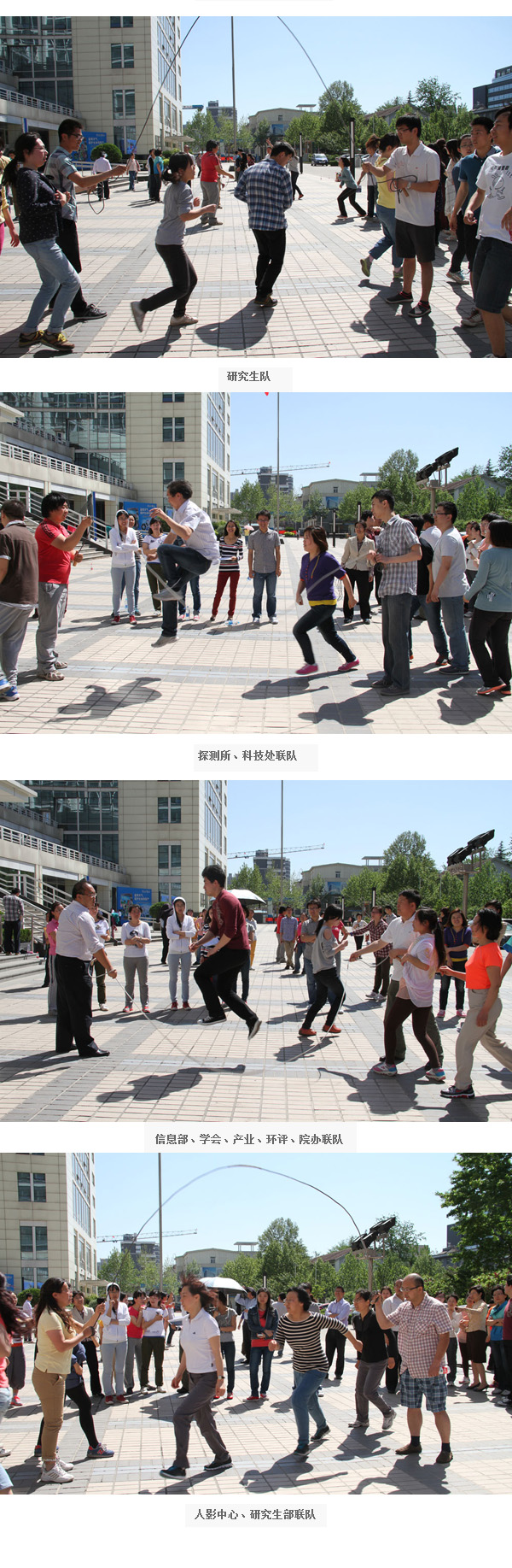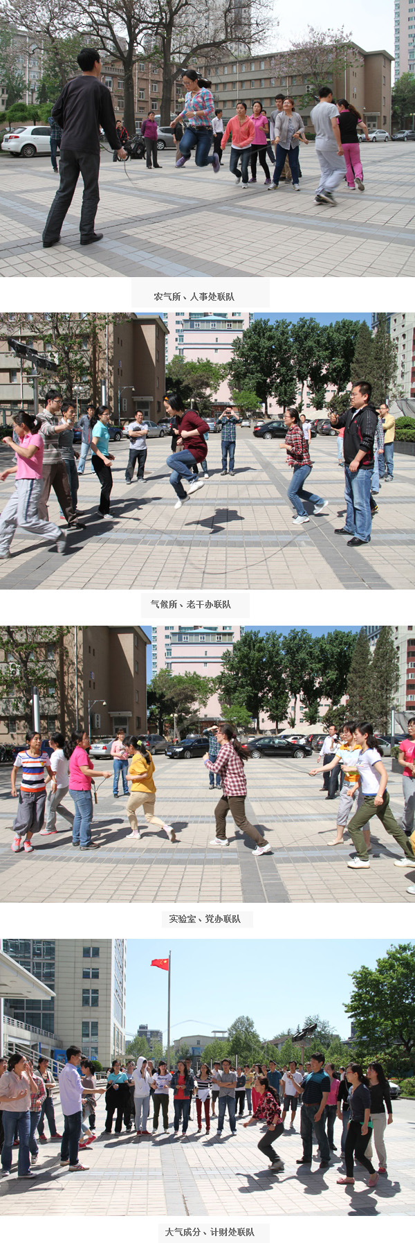 经过一个多月的积极训练,5月10日上午,气科院由各单位组织的8个青年联队在院办公楼前进行了青年集体跳绳比赛。各联队参赛队员团结协作、奋勇拼搏、步调一致,以最佳表现为本队争取优异成绩。