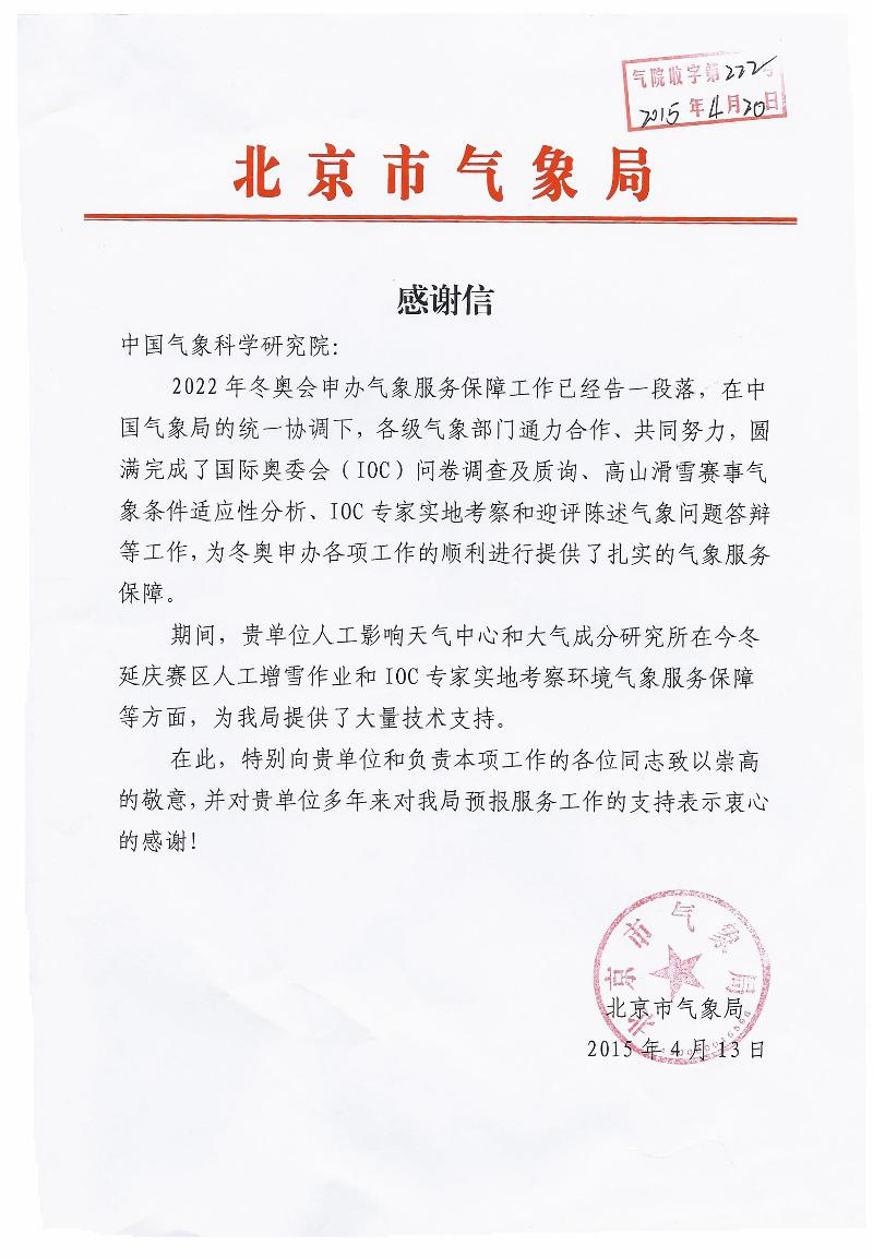 近日,北京市气象局发来感谢信,特别感谢我院人工影响天气中心和大气成分研究所专家在申办2022年冬奥会工作中提供的大力技术支持,为冬奥会申办工作的顺利进行提供了有力的气象服务保障。希望我院科研人员继续关注重大气象服务保障和灾害性天气,积极发挥优势,扎实做好相关服务的科技支撑工作。