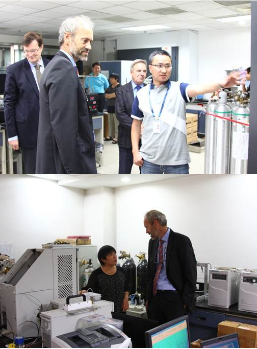 参观中大气成分研究所孙俊英所长向来宾介绍了气科院大气成分在基础观测、实验室分析、预报模式建立及应用等方面研究现状。随后孙俊英及方双喜带领来宾参观了温室气体、气溶胶分析等实验室。