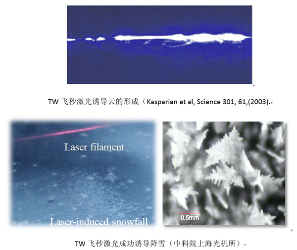 最近几年,随着激光技术的快速发展,科学家首先在实验室发现太瓦(TW)飞秒激光可以显著诱导云降水的形成,为人工影响天气开辟了新技术途径。由于此发现具有潜在重大应用价值,欧美、中国等从事激光的科研人员近年开展了大量实验研究,目前已在激光诱导云降水形成原理、激光引雷等领域取得了重要研究进展,相关成果在Science, Nature等刊物上进行了报道。