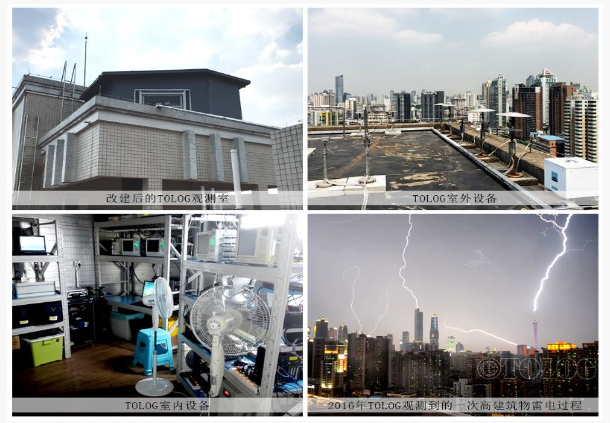 广州高建筑物雷电观测站TOLOG(Tall-Object Lightning Observatory in Guangzhou)始建于2009年,是广州野外雷电试验基地的一个重要组成部分。TOLOG位于广东省气象局,主要针对广州高建筑群上发生的闪电活动开展综合观测与研究。建成以来,已取得了多项创新性研究成果,得到了国内外同行的高度关注和认可。特别是在国际上首次发现了雷电连接过程中的侧击现象和先导连接行为的多样性,深化了对雷击过程中极为重要的连接过程的科学认识,揭示了连接过程中先导通道的发展特征及其变化规律,为雷电先导模式的发展以及雷电防护技术的研究提供了观测依据。