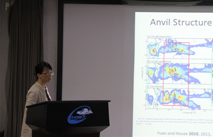 邓敏博士详细介绍了基于Calipso-lidar,Cloudsat-rador观测数据判别热带深对流、云砧的方法,并对判别出的深对流、云砧的空间尺度、变化特征、地区差异等进行了详细介绍,最后,邓敏博士还对数值模式中模式分辨率对云模拟的影响做了相关介绍。