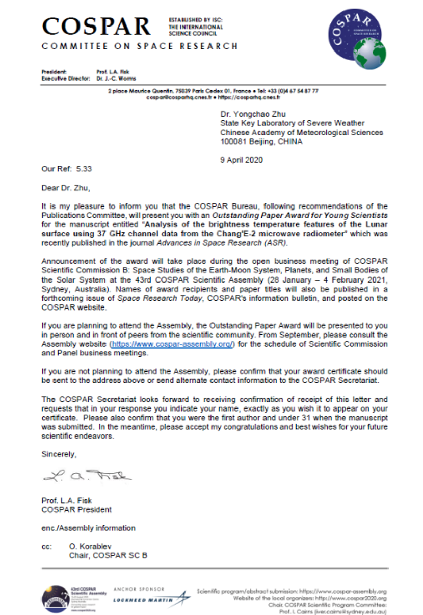 COSPAR主席L.A. Fisk教授在2020年4月9日签署的信函中正式通知,该奖项将在2021年1月28日到2月4日的在澳大利亚悉尼召开的第43届COSPAR科学大会期间颁奖。“COSPAR青年科学家杰出论文奖”从2008年开始颁发,随COSPAR科学大会的举行,每2年评选和颁布一次。著名的中国科学院-国际空间研究委员会(CAS/COSPAR)赵九章奖也是国际空间研究委员会的八个奖项之一。