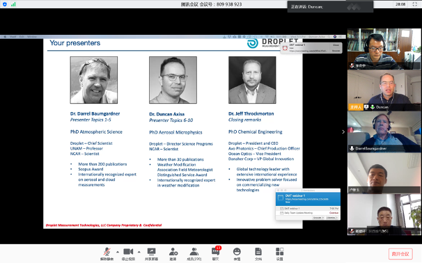 为应对疫情给国际学术交流带来的诸多不便,本次会议特别采用网络视频会议的方式召开,同时,视频会议的形式也使更多人得以共享学术成果。会上,DMT公司首席科学家Dr. Darrel Baumgardener和云微物理专家Dr. Duncan Axisa分别针对云微物理特性、外场观测试验和暖云催化以及新仪器的研发应用等方面做了特邀报告。七天的视频技术交流会学术氛围浓郁,各单位的专家学者就当前人影科学领域关注的飞机观测试验方案设计、播云潜力研究和数值模拟等方面展开了积极讨论,并提出宝贵建议。同时,美国专家对当前云微物理研究中的重点难点以及机载探测仪器应用中出现的问题进行了深入的讲解和答疑。