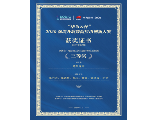 由人工智能气象应用创新团队主导组建的参赛队伍在“华为云杯”2020深圳开放数据应用创新大赛·粤港澳大湾区强降水临近预测赛题中获得三等奖。参赛成员包括中国气象科学研究院的3名科研人员高力浩(队长)、郑玉、武玮辰以及南京信息工程大学和中科院大气所的3名研究生。所用参赛模型由当前最先进的视频预测模型之一MIM改进而来,最终决赛评分排名第4。