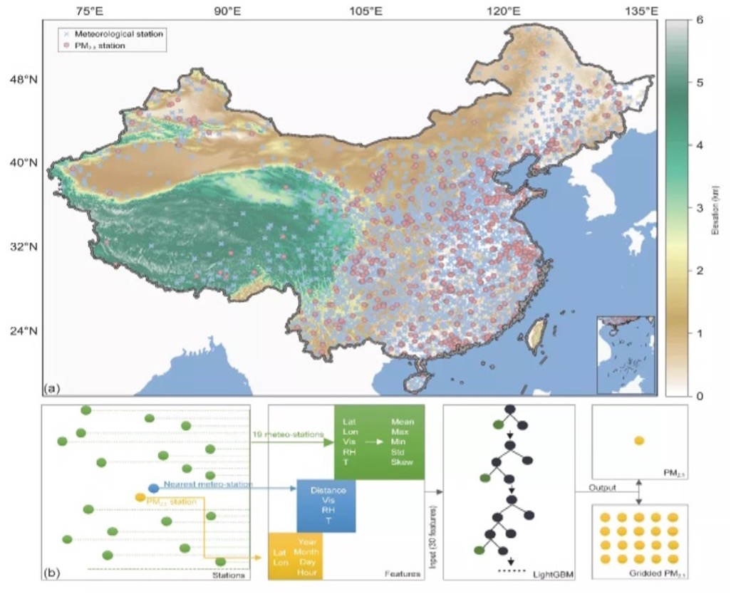 图1. (a)全国1440个PM2.5国控站和2450个国家级气象观测站的空间分布; (b)空间特征提取和模型构建的概念模型。