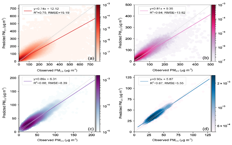 图2. 2019年观测的PM2.5和预测的PM2.5在(a)小时、(b)日、(c)月和(d)年时间尺度上的密度散点图(颜色为概率分布密度)。