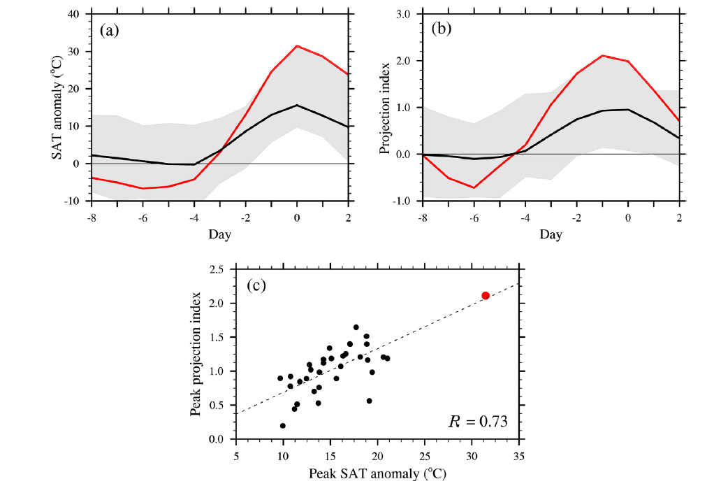 (a) 所有阻塞驱动的爆炸性增温事件(黑色曲线)和3.18爆发性增温事件(红色曲线)强度演变。(b)同(a),但为环流强度指数。(a) 和 (b) 中的灰色阴影显示所有事件从最大值到最小值的范围。(c) 所有爆发性增温的峰值与环流指数峰值的散点图,其中3.18事件标记为红点。(c) 中的黑色虚线表示最佳拟合线。