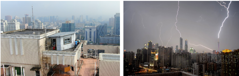 广州高建筑物雷电观测站(左)和视野内观测到的高建筑物雷电(右)
