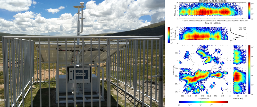 西藏那曲低频闪电定位网子站(左)及其定位到的一次雷暴过程三维闪电活动密度分布(右,闪电通道经过的地方即为有闪电)