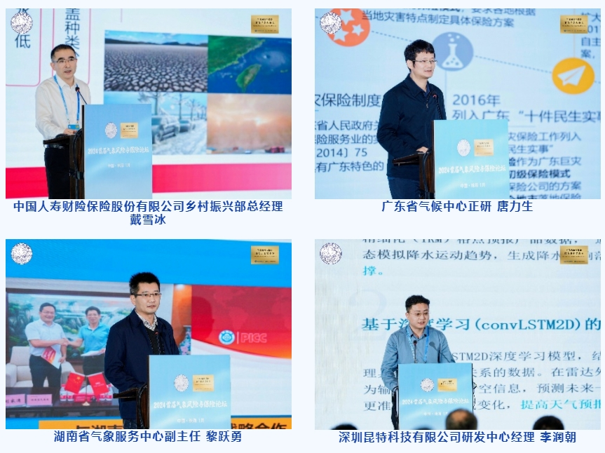 张迪副司长表示气象保险是2024年全国气象工作会议提出的重点工作任务之一,此次论坛的成功举办,正是落实全国气象工作会议精神的一项重要举措,也是落实总书记重要指示批示精神,助力金融强国战略的重要实践。下一步气象保险工作需要在三个方面加强,一是聚焦风险减量、充分挖潜,气象服务产品非常丰富,关键是如何在保险行业有效运用,要面向保险标的、保险人、被保险人需求,提升气象服务产品的针对性与精细化程度,在风险减量上发力;二是融合创新,气象在保险领域的应用场景很多,实践也很多,关键要在合作共赢的模式上有更多创新,通过总结前期合作经验教训,加强顶层设计,统筹谋划,使气象保险产品体系和重点任务更加清晰,更具指导性;三是强化科研引领,气象保险要在服务国家重大战略实施与经济社会发展中更好地发挥作用,核心在气象保险科研能力的提升,需要保险机构、高校、科研院所与气象部门的专家开展联合研发,共同促进保险气象高质量发展。