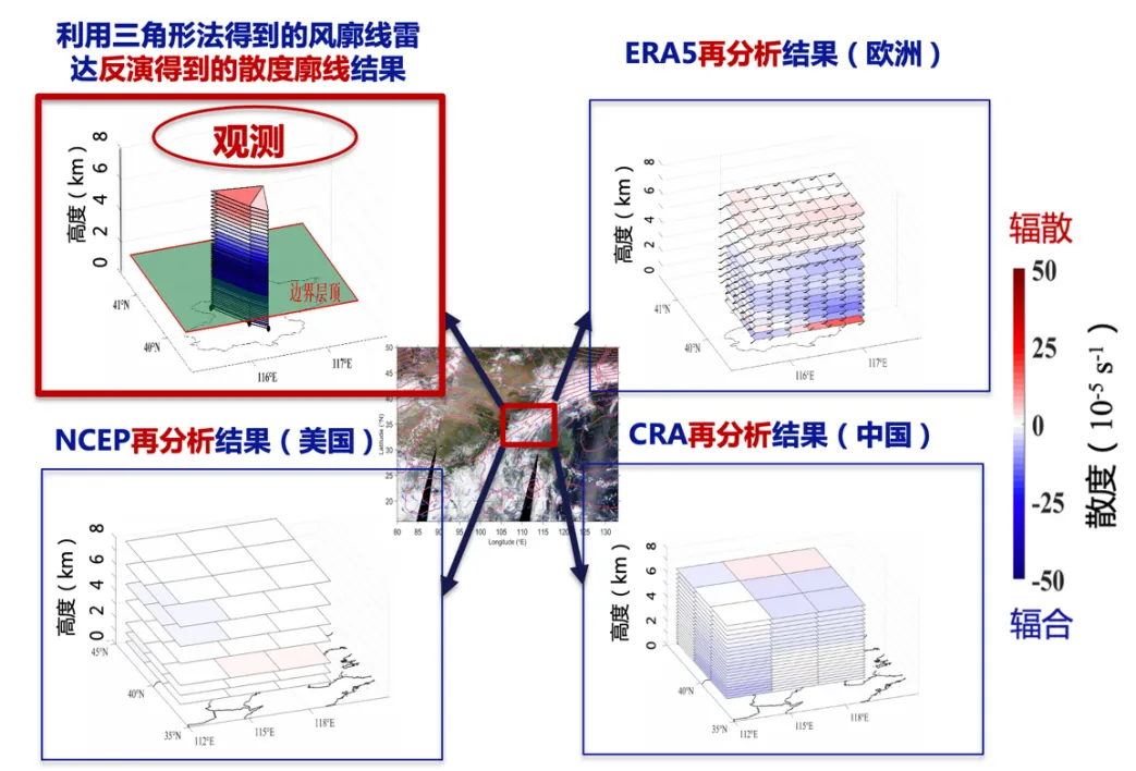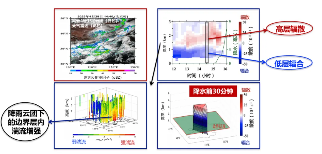 图3.风廓线雷达中尺度网反演的大气动力参数廓线首次用于2023年4月28日北京冰雹天气复盘。左上图中为该日14:40风云四号卫星云图和天气雷达回波,展现出京津冀地区受位于内蒙古中东部的冷涡云团影响下爆发的强对流天气。右上图为北京地区风廓线雷达反演得到的散度廓线(填色)和降水(绿色实线)的时间演变。在15:10北京降水发生前呈现低层辐合,高层辐散的大气动力环境。右下图为降水前30分钟北京上空风廓线雷达三角形组网反演得到的散度精细的垂直结构,存在明显的低层深厚辐合的动力廓线信号,利于气团垂直上升触发对流。左下图为利用全国风廓线雷达反演得到的边界层湍流强度(填色)垂直分布,北京上空降水云团下伴随着边界层强湍流现象。