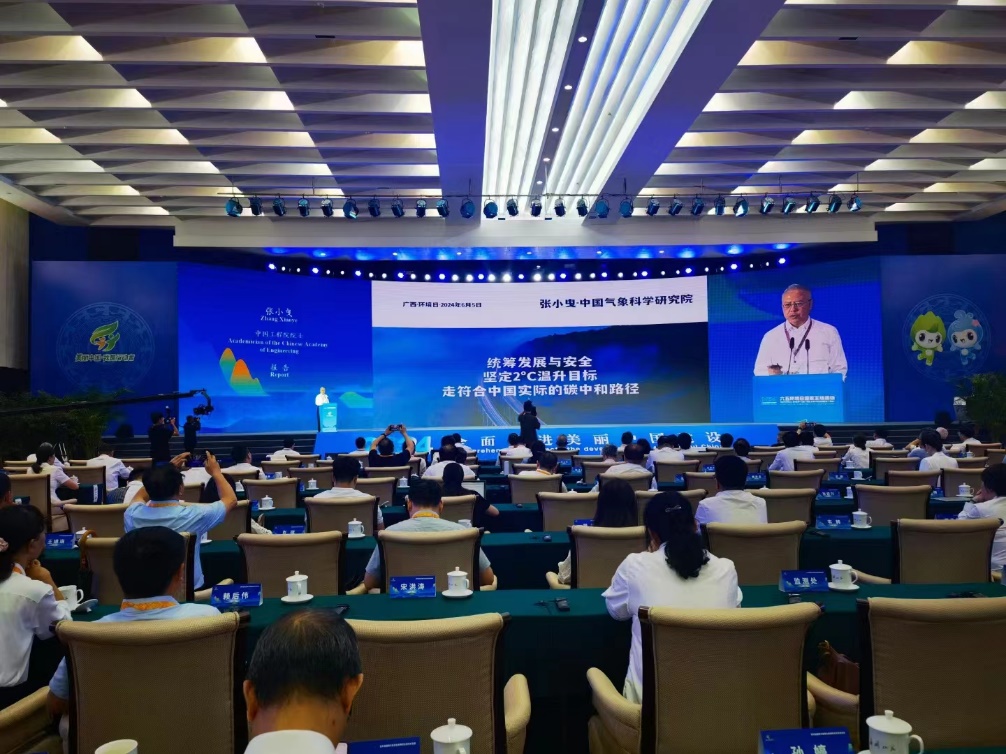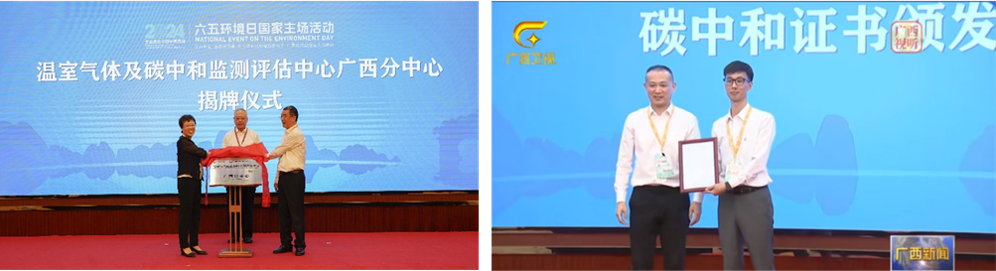 会议期间,由广西壮族自治区政府与生态环境部联合主办了筑牢祖国南方重要生态屏障主题活动,以践行绿水青山就是金山银山的理念,聚焦碳达峰碳中和战略目标以及发展方式绿色转型等方面,发布实践性成果,为加快推进人与自然和谐共生的现代化凝聚共识、汇聚力量。会上,张小曳院士见证了广西壮族自治区气象局、自治区生态环境厅共同建设的温室气体及碳中和监测评估中心广西分中心揭牌,中国气象局科技与气候变化司副司长张兴赢(时任广西壮族自治区生态环境厅副厅长)还颁发了2024年六五环境日国家主场活动碳中和证书。