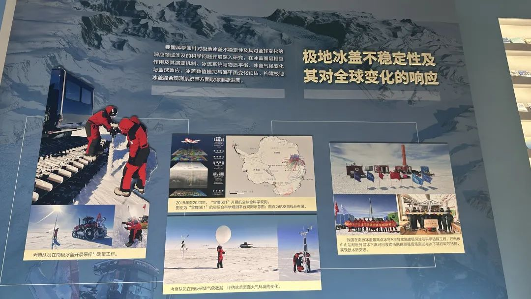 在展览现场,除了这两件参展展品外,气象元素随处可见——新年伊始,科考队员将对祖国、家人的祝福写在一只红色的气象探空气球上,带着期盼将其放飞;第一次南极科考队员签字留念簿上,卞林根的签名气势非凡;第39次南极科考队员、来自气象科学研究院的田彪手持气象部门自主研发的冰雪观测仪专注于雪剖面观测;中国气象局原局长、“中国徒步横穿南极大陆第一人”秦大河院士自传式图书《大穿越》记录了人类首次徒步穿越南极大陆的故事……在这些展览面前,众多观众驻足观看。