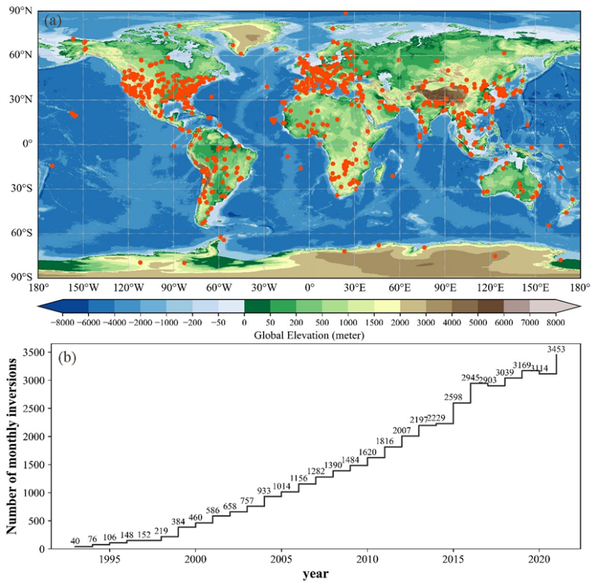 图1.研究所使用的AERONET全球站点时空分布情况
