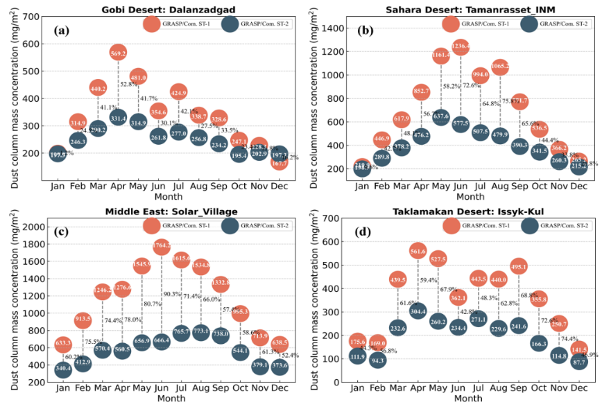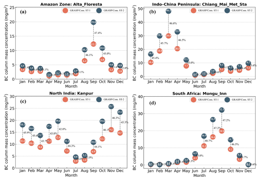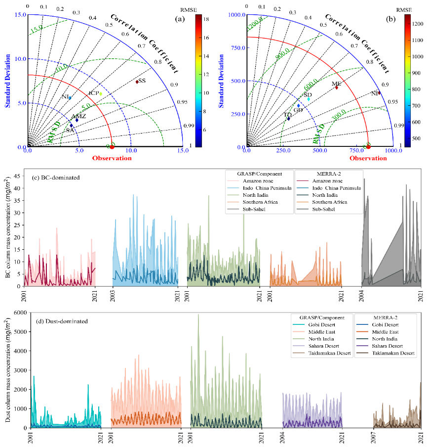 图4.地基反演黑碳、沙尘产品与MERRA-2再分析对比结果