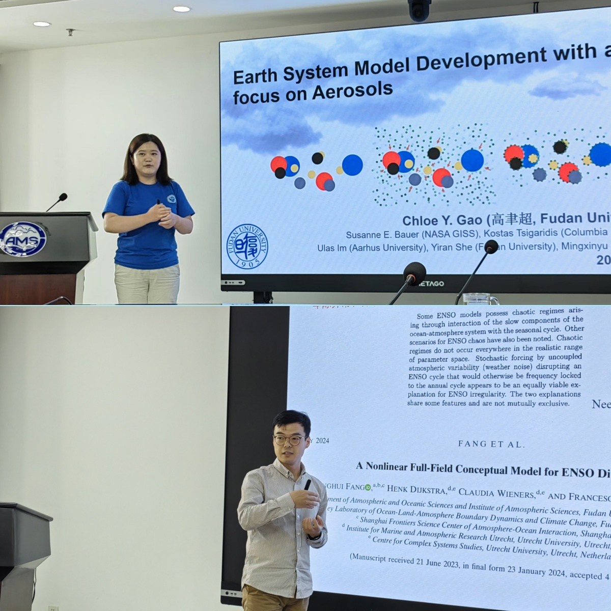 会前,复旦大学大气与海洋科学系领导和教师与联培研究生举行了座谈会,对研究生奖助学金、毕业就业、学习生活等方面的疑问作了解答,并送上了中秋节日的问候。青年科学家高聿超和方向辉分别做了《Earth System Model Development with a focus on Aerosols》和《ENSO多样性的理论建模研究》学术报告。