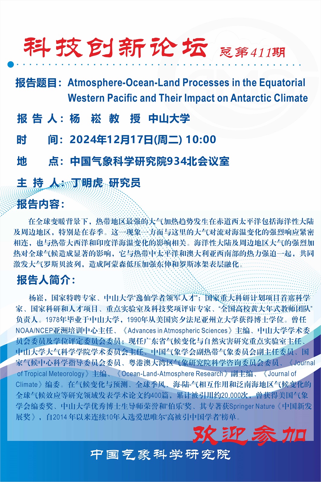 > 【科技创新论坛第411期】-Atmosphere-Ocean-Land Processes in the Equatorial Western Pacific and Their Impact on Antarctic Climate(杨崧)