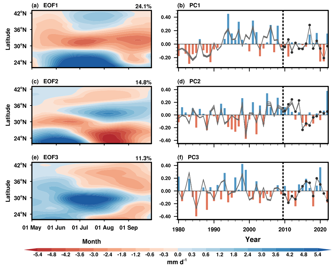 图1东亚陆地汛期降水异常的主要时空演变型及其年际变化序列。左列图为1980–2009年汛期东亚纬向平均降水异常的前3个时空演变经验正交函数模态(单位:mm/day)。右列图中条形柱为3个演变型对应的归一化主成分的年际变化时间序列,灰线为基于物理统计模型的预测新方法回归的主成分变化。黑色圆点代表2010–2022年间滚动独立样本检验的预测值。