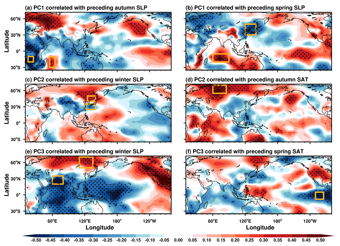 图2 东亚汛期降水异常的前三个时空演变型主成分序列与前期不同季节海平面气压(SLP)和地表气温(SAT)异常的年际变化相关系数分布图。图中黑点表示信度超过90%的显著性区域。黄框指示了演变型对应的主要前兆信号。