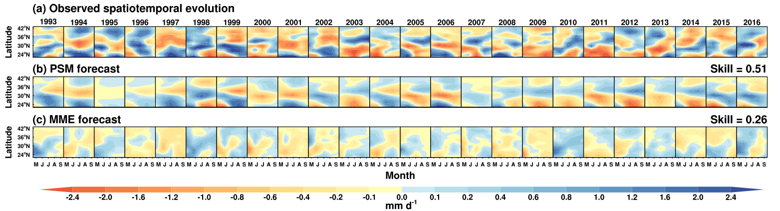 准确的季节预测对于保障世界人口密集地区(如东亚)的粮食和水资源安全等至关重要,对减少大范围且连续性旱涝灾害造成的巨大经济损失和人员伤亡等具有重要实际价值。然而,当前国际主流的动力业务模式对东亚陆地降水的季节预测能力十分有限,尤其对汛期降水异常的时空演变(如雨带推进/撤退)预测更具挑战性。现有国际动力模式和统计预测模型尚未实现对东亚陆地汛期降水异常的季节时空演变的准确预测,研究方法极少,一直是国际性难题。