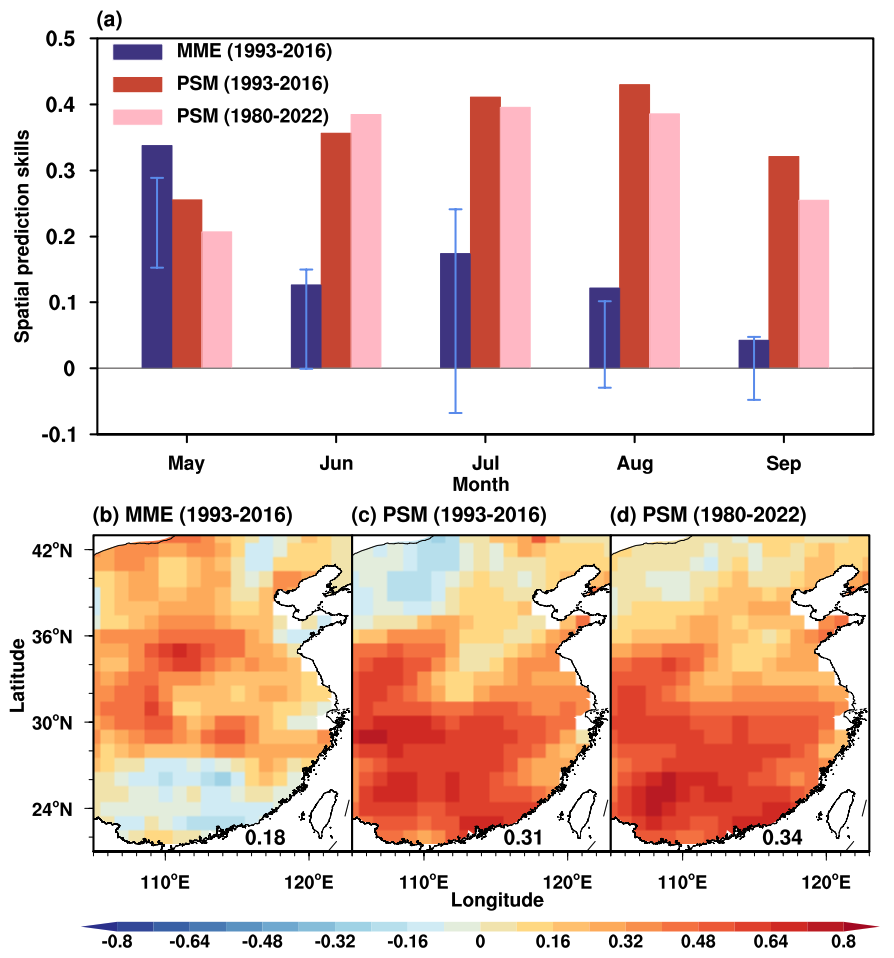图4 东亚陆地汛期降水异常的时空演变和夏季平均的预测技巧。(a)多模式集合平均(MME)和物理统计预测新方法(PSM)的逐月总降水异常的多年平均预测技巧。蓝线表示单个动力模式的预测技巧范围。(b)MME平均,(c、d)PSM对应的夏季平均降水异常的时间相关系数预测技巧,对应预测技巧的区域平均值显示在(b–d)的右下角。
