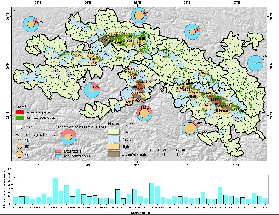 图1 :(a) 藏东南流域冰崩灾害分布,以及危险性冰川的面积和比例,(b)高和极高危险程度流域的危险性冰川面积