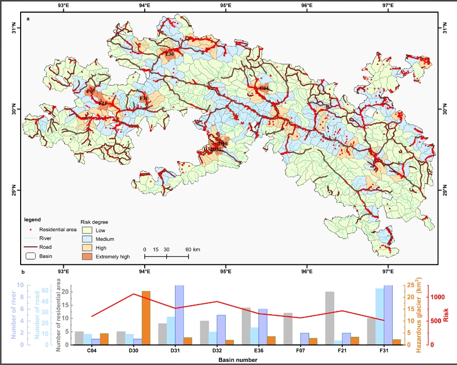 研究进一步结合当地的社会经济条件,对冰崩风险进行量化计算,从而到藏东南地区风险评估结果(图2)。该研究结果不仅为藏东南地区的冰崩灾害预警和防治提供了科学依据,也为类似地区的风险评估提供了可借鉴的方法论框架。