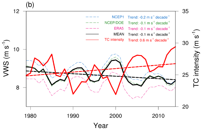 图1:基于多源观测资料的1979-2014年期间7-9月平均西北太平洋季风槽区域垂直风切变与热带气旋强度趋势特征.(a)垂直风切变趋势的空间分布.(b)季风槽区域平均垂直风切变与热带气旋强度的时间序列及趋势.(c)对流层上层(200 hPa)风和下层(850 hPa)风对垂直风切变减弱的各自贡献.图1a中红色方框为北半球夏季热带气旋活跃的季风槽区域。