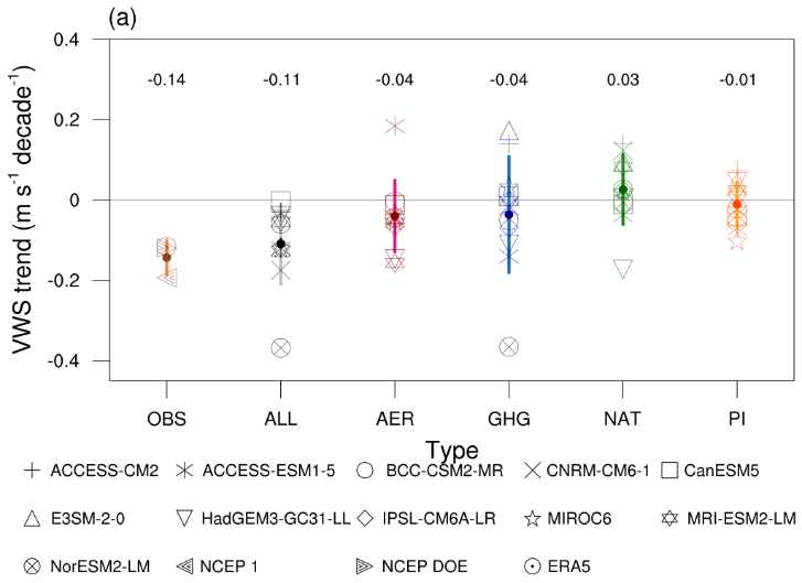 近几十年来,西北太平洋地区热带气旋强度呈现持续增加趋势,致使近年来超强台风事件频繁发生,严重危害我国经济社会发展与碳中和能源转型。已有研究指明西北太平洋地区同期垂直风切变的减弱趋势是热带气旋强化的重要驱动因素。然而,人为因素对垂直风切变减弱的贡献目前尚不明确。