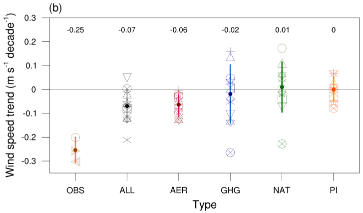 图2:基于多源观测和CMIP6多模式试验的1979-2014年期间7-9月西北太平洋季风槽区域平均(a)垂直风切变和(b)200 hPa风的长期线性趋势.OBS、ALL、AER、GHG、NAT和PI分别代表基于多源观测数据、CMIP6全强迫、气溶胶强迫、温室气体强迫、自然强迫和气候系统内部变率试验的结果。