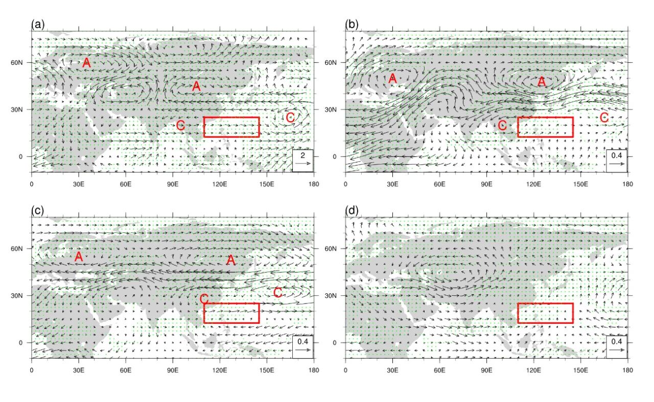 图3:基于(a)多源观测数据、CMIP6多模式(b)全强迫、(c)气溶胶强迫和(d)温室气体强迫试验结果的1979-2014年期间7-9月平均200 hPa风的线性趋势的空间分布情况.图中“A”和“C”分别代表反气旋和气旋异常。