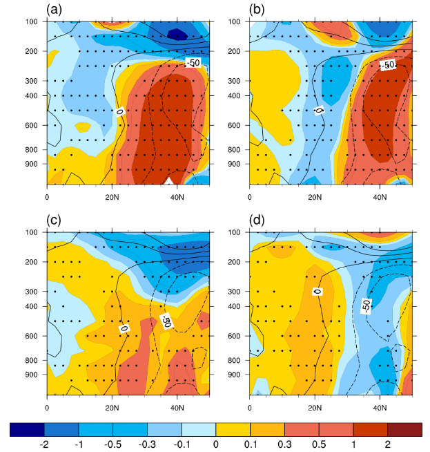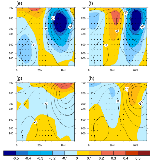 图4. 基于CMIP6多模式(a和e)全强迫、(b和f)气溶胶强迫、(c和g)温室气体强迫和(d和h)自然强迫试验结果的1979-2014年期间7-9月东亚地区纬向平均(a-d)大气经向温度梯度和(e-h)纬向风长期趋势的气压-经向剖面分布情况。