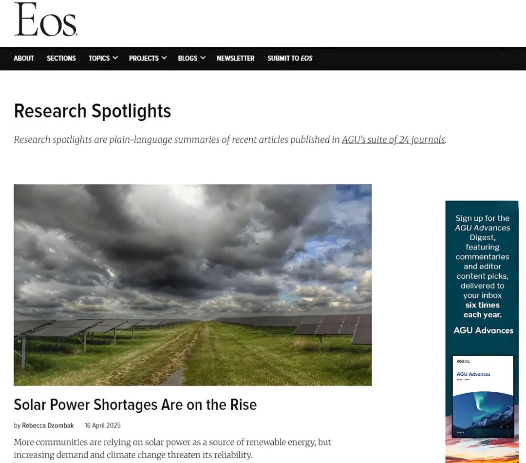 近日,中国气象科学研究院大气成分与环境气象研究所(碳中和监测与评估中心)雷亚栋等发表在《Geophysical Research Letters》上的文章“Global Solar Droughts Due To Supply-Demand Imbalance Exacerbated by Anthropogenic Climate Change”被美国地球物理学会(AGU)会刊Eos选为研究亮点(Research Spotlights),并以“Solar Power Shortages Are on the Rise”为题进行了报道,同时也被国际能源媒体以“Rising demand and climate change drive solar power shortages”为题报道: