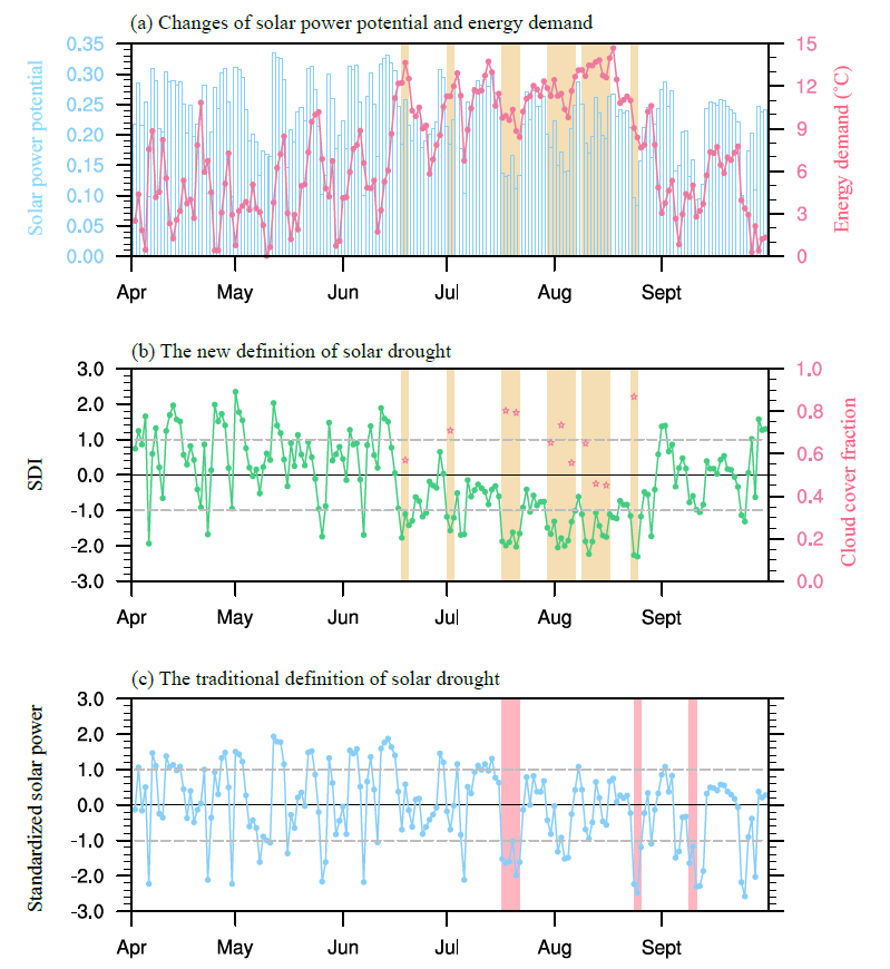 图1 新定义的供-需不平衡太阳能干旱指数在中国东部网格点(32°N, 115°E)2013年暖季的应用以及与传统定义的对比分析。