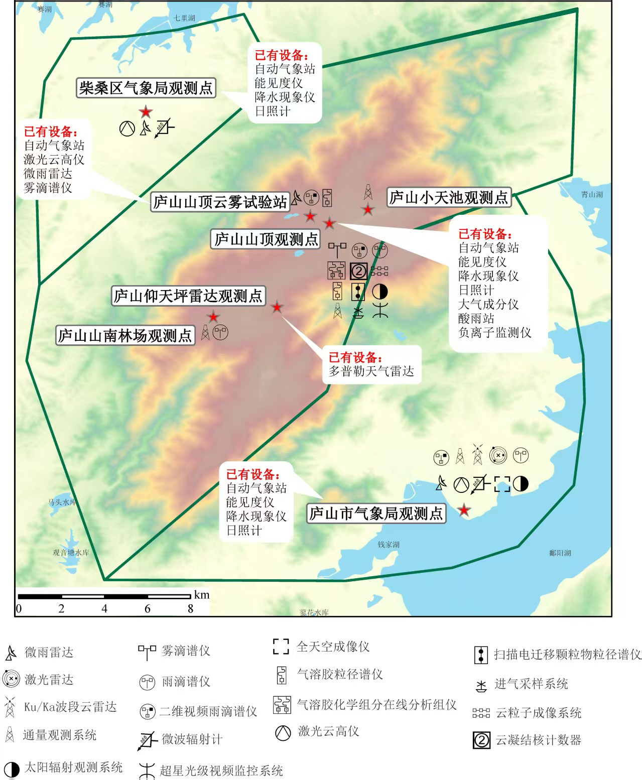 中国气象局庐山云雾物理与化学野外科学试验基地由6个不同海拔高度的观测站点组成,力求通过发展云雾立体观测新技术新方法、云雾模拟技术和云雾催化技术,建设成为国内领先、国际一流的云雾物理与化学野外科学试验基地,深化云雾理化演变机理、云雾-气溶胶-降水相互作用机理、云雾催化理论、地球关键圈层影响云雾机制等认识,为数值天气预报、气候变化评估、人工影响天气等国家重大需求提供科技支撑。