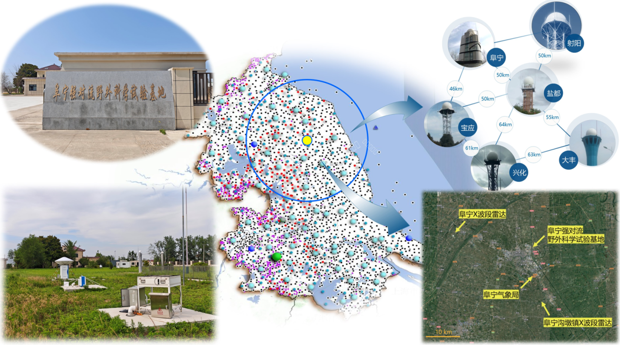 中国气象局阜宁强对流野外科学试验基地基于“一主多辅”的建设模式,主站位于盐城市阜宁县,辅站包括周边国家级及区域级观测站。针对强对流灾害性天气,基于多类型特种观测设备、固定观测站网及移动观测平台,开展协同观测科学试验。通过建立系统性、长时间序列的协同观测数据集,加强外场观测与强对流数值预报的融合,基地重点开展强对流天气发生发展过程、多尺度精细结构特征及相互作用过程研究,深化对强对流天气演变机制和致灾机理的认识,加强预警预报技术研发。