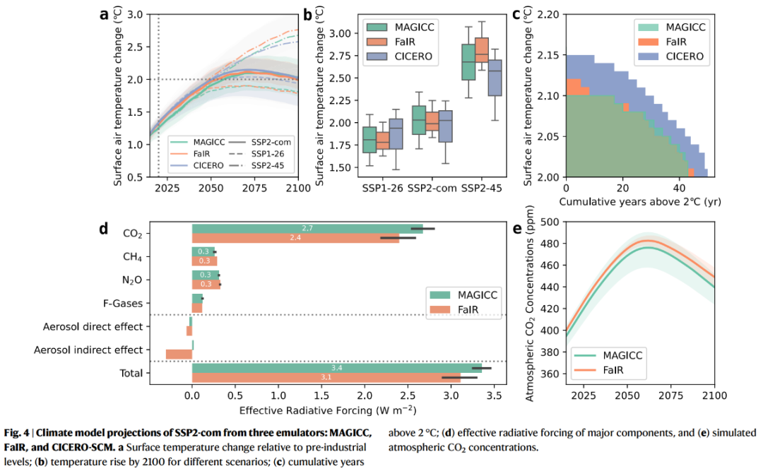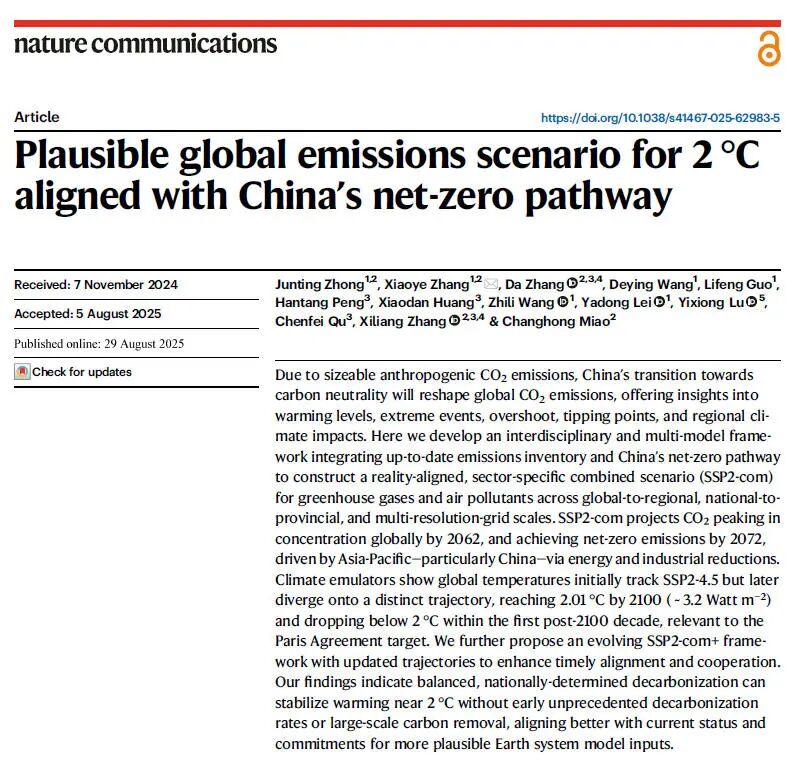 近日,中国气象科学研究院张小曳院士与清华大学、河南大学等团队在国际顶级学术期刊 Nature Communications 发表最新研究成果,构建了一个与我国碳中和进程紧密协同的全球减排与温控情景,为推动实现《巴黎协定》温控目标提供了新的科学支撑。研究指出,我国碳中和转型将重塑全球碳排放格局,为理解增温水平、极端事件、气候临界点及区域气候影响提供重要依据,但现有全球排放情景下既定的我国排放轨迹,与当前态势、2030年碳达峰目标及2060年碳中和目标相比,存在显著差距。为此,团队构建了一个更加符合现实约束的2℃温升目标与我国碳中和协同的全球排放情景(SSP2-com),并提出动态更新的扩展框架(SSP2-com+),以动态纳入各国最新的减排承诺与数据。