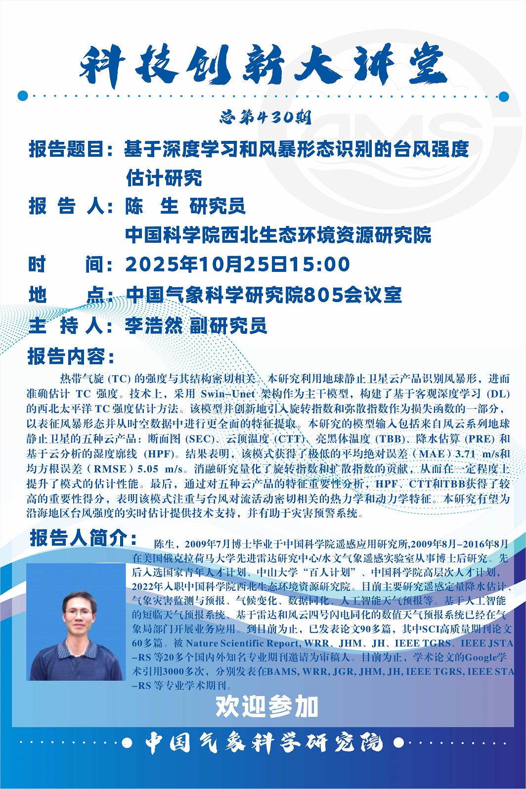 > 【科技创新大讲堂第430期】-基于深度学习和风暴形态识别的台风强度估计研究(陈生)