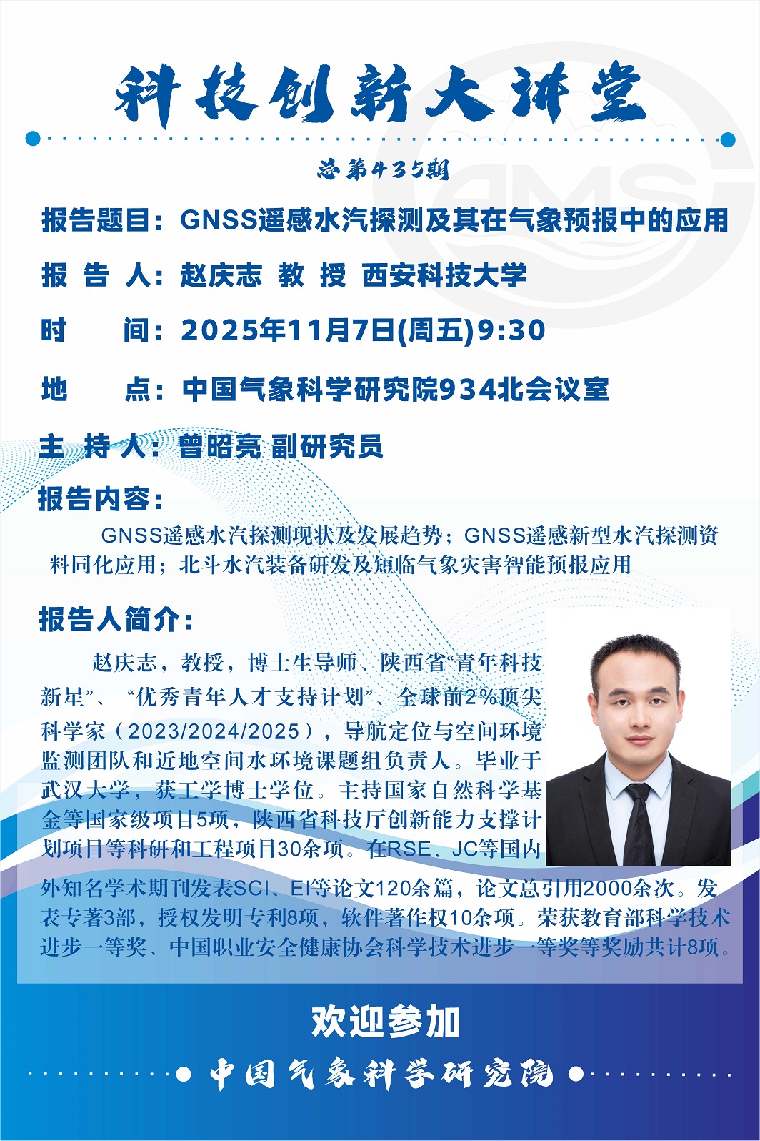 > 【科技创新大讲堂第435期】-GNSS遥感水汽探测及其在气象预报中的应用(赵庆志)